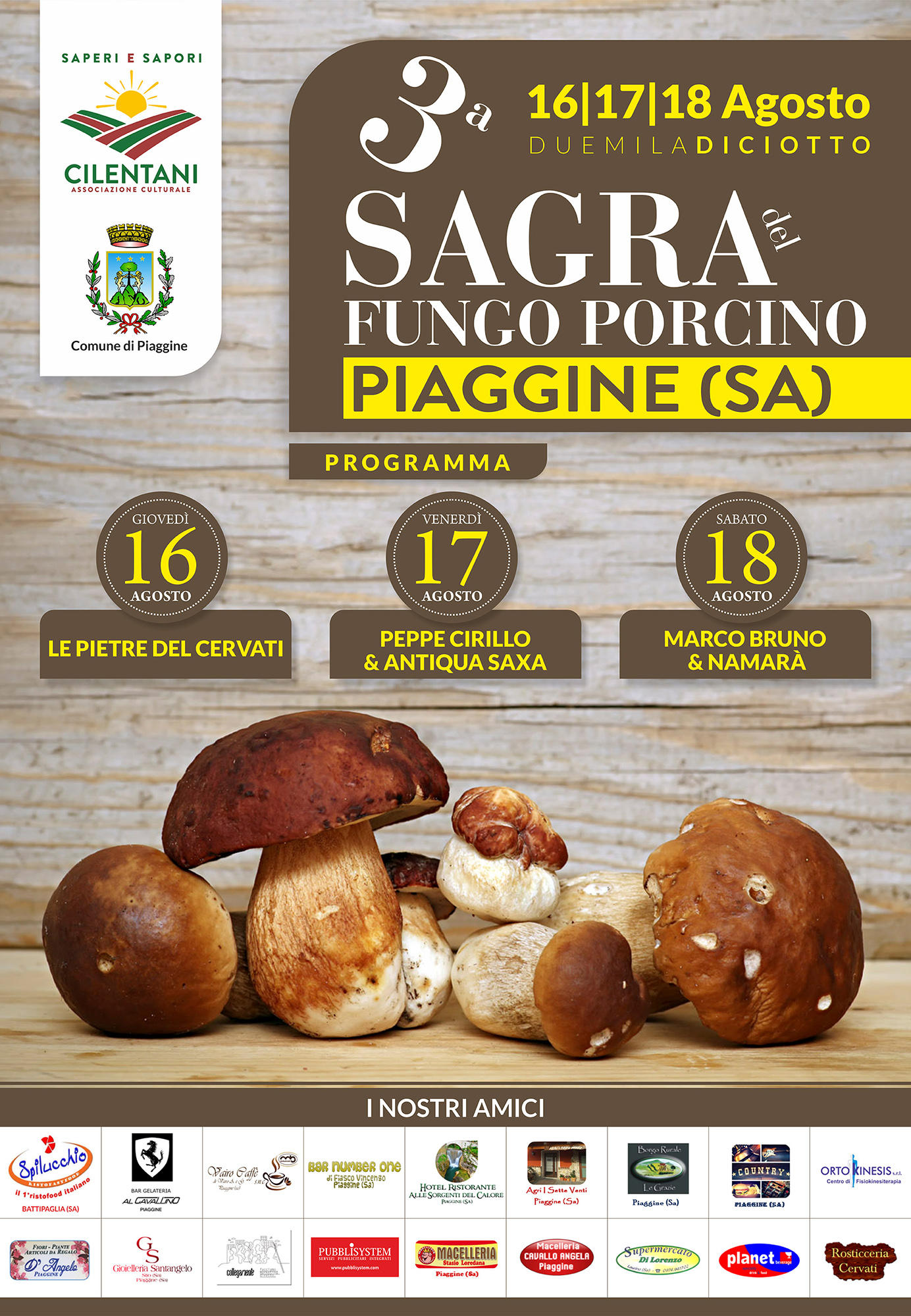 Il Comune di Piaggine, Salerno, si prepara alla III edizione della Sagra del Fungo Porcino. Appuntamento il 16, 17 e 18 Agosto 2018 La manifestazione, curata dall’Associazione Culturale “Saperi e Sapori Cilentani” e patrocinata dal Comune di Piaggine, vede come protagonista il gusto e l’aroma inconfondibili del fungo porcino. Per l’occasione, la splendida cornice di […]